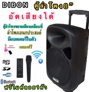 ลำโพงพร้อมไมค์ DIBON แบบลากจูง 8นิ้ว2ทาง ให้เสียงทุ้ม เสียงแหลม กำลังขับ 20 วัตต์ หน้าจอเป็นแบบ LED party light สามารถสั่งงานผ่านรีโมทคอนโทรล รองรับเทคโนโลยีบลูทูธ สามารถเชื่อมต่อผ่านพอร์ต USB,SD และมีวิทยุ FM. ที่ตัวไมโครโฟนสามารถอัดเสียงได้