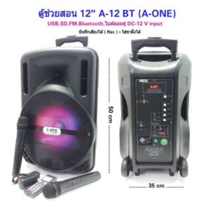 ลำโพงพร้อมไมค์ A-ONE A-12BT รองรับการใช้งานผ่านพอร์ต USB,SD Card รองรับเทคโนโลยีบลูทูธ สามารถใช้ได้กับสมาร์ทโฟนในระยะ10 เมตร ใช้ดอกลำโพงขนาด 12นิ้ว ทำจากไฟเบอร์ให้น้ำหนักเบา นอกจากนั้นยังสามารถปรับเสียง BASS และ TREBLE และเสียบขาตั้งลำโพงมาตรฐานได้ มีช่องเสียบไมค์ 1ช่อง ช่องวอลุ่มปรับเสียงไมค์และเสียง ECHO ครบครัน